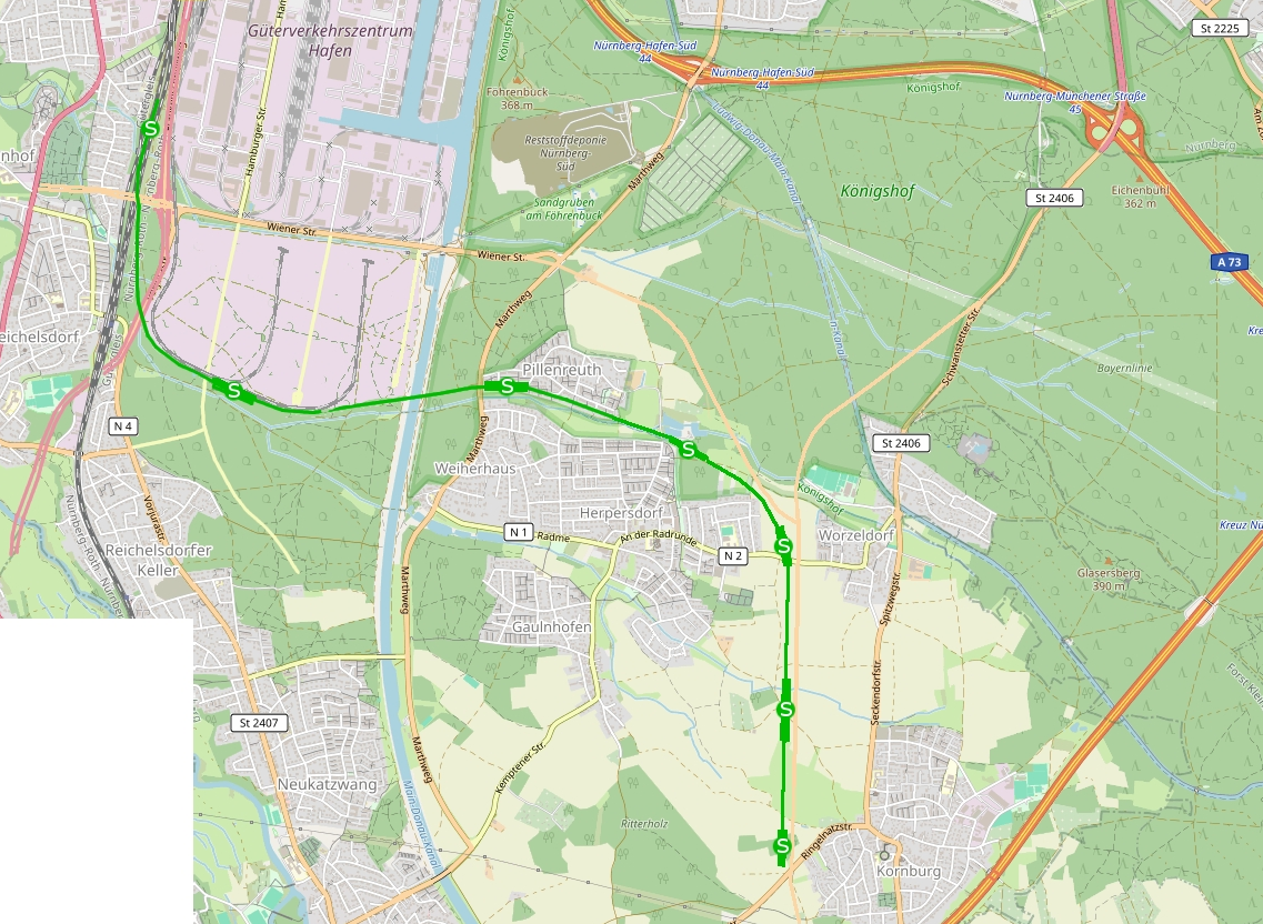 Zu 2.: Für einen Anschluß an das S-Bahnnetz steht die bestehende Bahnlinie nach Schwabach, die in eine S-Bahnlinie umgewandelt werden soll, bereits jetzt zur Verfügung. Die neue Strecke würde von der Hauptlinie zwischen den Bahnhöfen Eibach und Reichelsdorf abzweigen, das Hafenindustriegebiet Süd auf der Südseite umgehen und zwischen Königshof und Weiherhaus das Entwicklungsgebiet Worzeldorf/Kornburg erreichen. Für diesen Planungsgedanken sprechen folgende Gesichtspunkte: