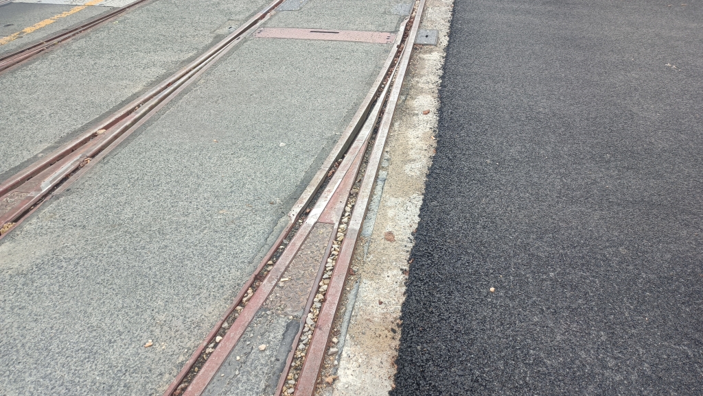 ^ Und... es fluchtet mal wieder net. Wahrscheinlich will man diesmal unterbinden, das zwischen Gehsteig und Gleis noch geparkt werden kann, und dann die Autokutscher wieder die Breite ihrer Karre falsch einschätzen, jedefalls liegt das neue Gleis nun näher am Gehweg...