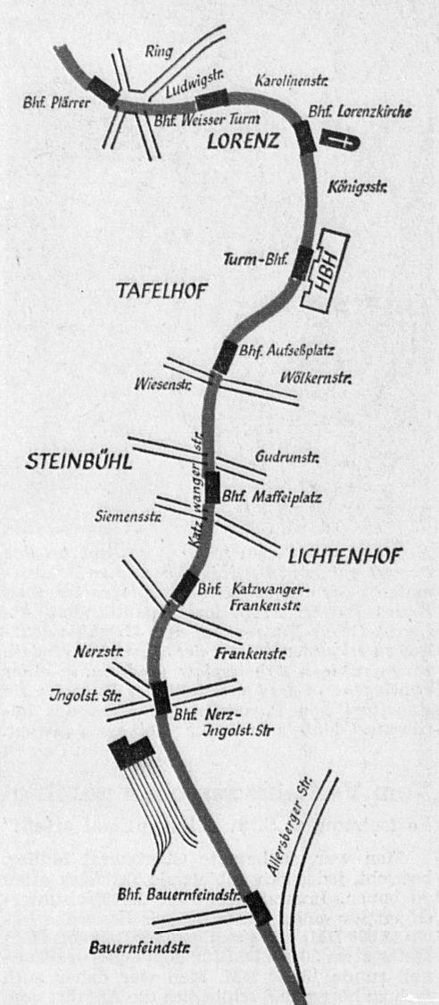 Wenn des Rätsels Lösung hier nicht die (ausserhalb des sichtbaren Bildausschnitts mit einem kurzen Gleis als kleine Bauvorleistung bereits angedachte) und weiter geplante südöstliche Verlängerung der Straßenbahnline 1 als Unterpflasterstraßenbahn nach Langwasser ist (die relativ enge Kurve unter der Münchner Straße hindurch stammt übrigens aus dieser ehemaligen Planung und wurde für die U-Bahn später einfach übernommen) dann ist wohl eine Nachnutzung der im Bild sichtbaren nördlichen Trasse der Straßenbahnline 1 bis zur Bayernstraße für die U-Bahn zum Hauptbahnhof gemeint, die dann aber zugunsten der heutigen Linienführung über Frankenstraße und Aufseßplatz zum Hauptbahnhof nie umgesetzt wurde?