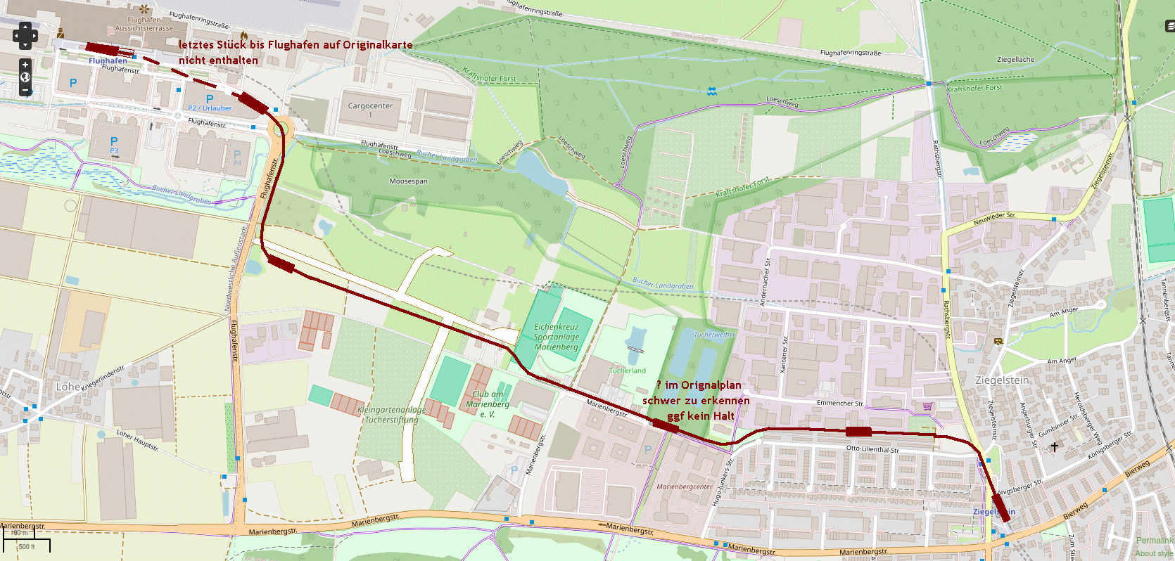 zur H-Bahn in Moorenbrunn habe ich tatsächlich noch nix gefunden (zugegeben auch nicht geziehlt gesucht), was ich habe sind Überlegungen für eine H-Bahn Ziegelstein - Flughafen, deren Streckenplan muss ich aber erst in einem open-Maps-Plan übertragen. Da das ja um historische Forschungen geht, denke ich, kann man einen kurzen Exkurs dorthin wagen, das Dokument stammt aus den selben Ordner wie die obigen also Stadtarchiv Nürnberg C 75 Nr 578
