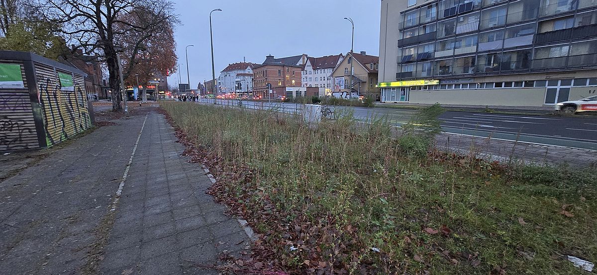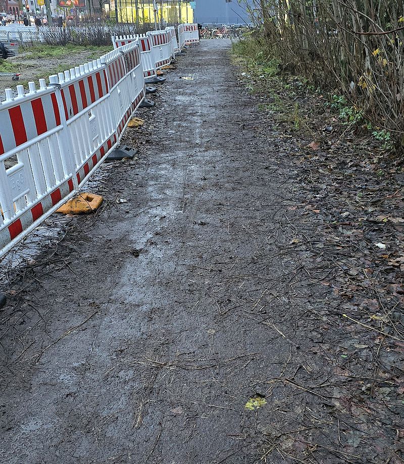 So ein Weg wäre aber nicht sinnvoll, um eine richtige Alternative zum jetzigen über die Haltestelle führenden Weg zu sein. Warum sollte man aus Richtung Einkaufszentren oder Brückenstraße so einen Umweg nehmen?