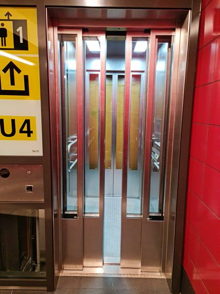 Was ich persönlich für schwierig halte, da z. Bsp. die Platzverhältnisse in der Ebene der U7 (wo ich dieses bestmmte Foto versucht habe zu erstellen) so beengt sind, dass man Personen, die aus dem Aufzug aussteigen, vollständig durchgelassen haben muss, bevor man selbst in den Aufzug einsteigen kann und dabei von so schnell wieder schließenden Türen davon abgehalten wird, dass man zu perplex ist, die richtige Handlung durchzuführen (wild auf den Öffnungsknopf "zu hämmern").