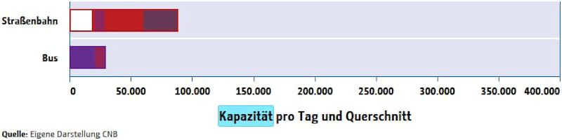 (2) Standardbusse (12 m, Fahrgastkapazität ca. 65 Personen), Gelenkbusse (18 m, Fahrgastkapazität ca. 100 Personen) oder Doppelgelenkbusse (24 m, Fahrgastkapazität ca. 140 Fahrgäste, dürfen nur mit Sondergenehmigung verkehren), Straßenbahnen (30-50 m, Fahrgastkapazität 170-300 Fahrgäste)