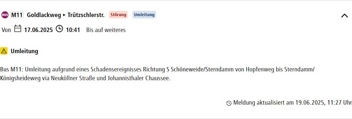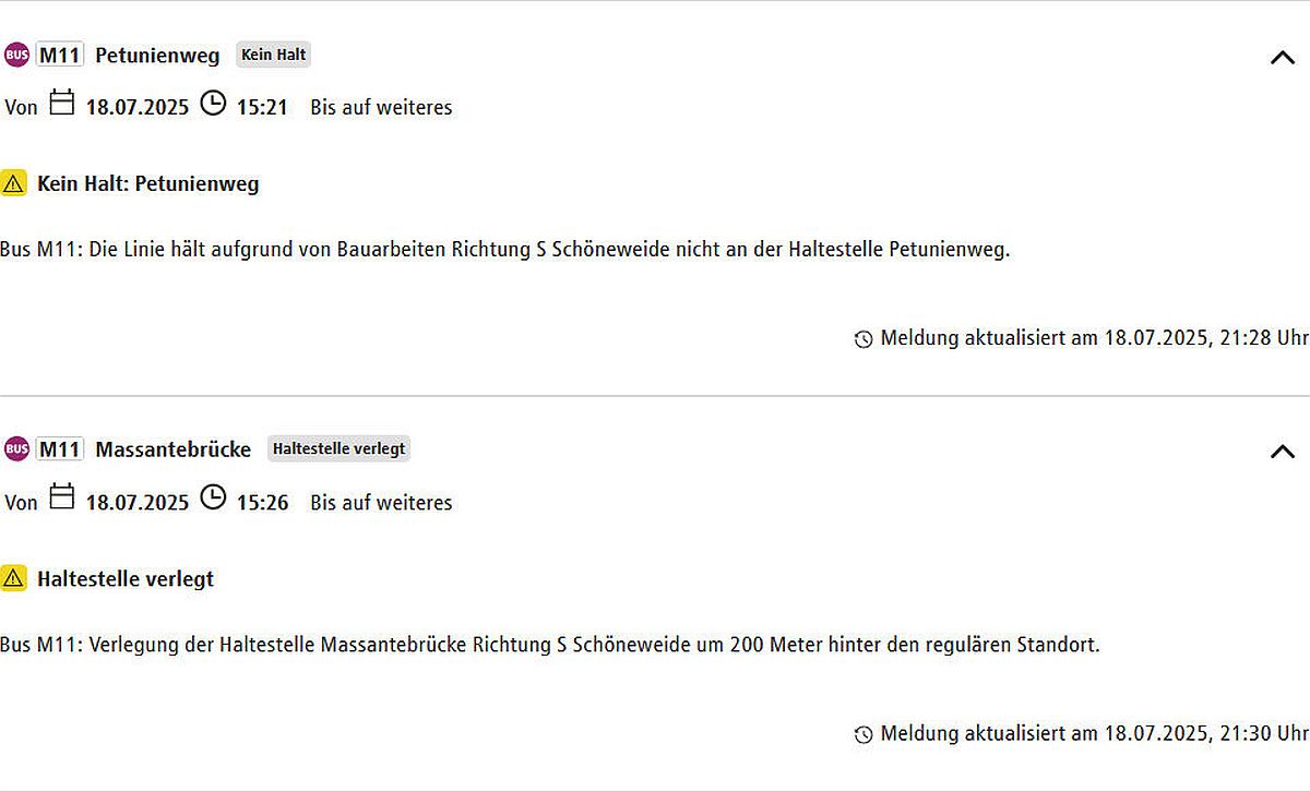 Gestern wurden die Verkehrsmeldungen zu den Buslinien M11 und 172 noch einmal geändert. Es scheint, dass man jetzt die erste und letzte Haltestelle nennt, die nicht mehr angefahren werden kann: